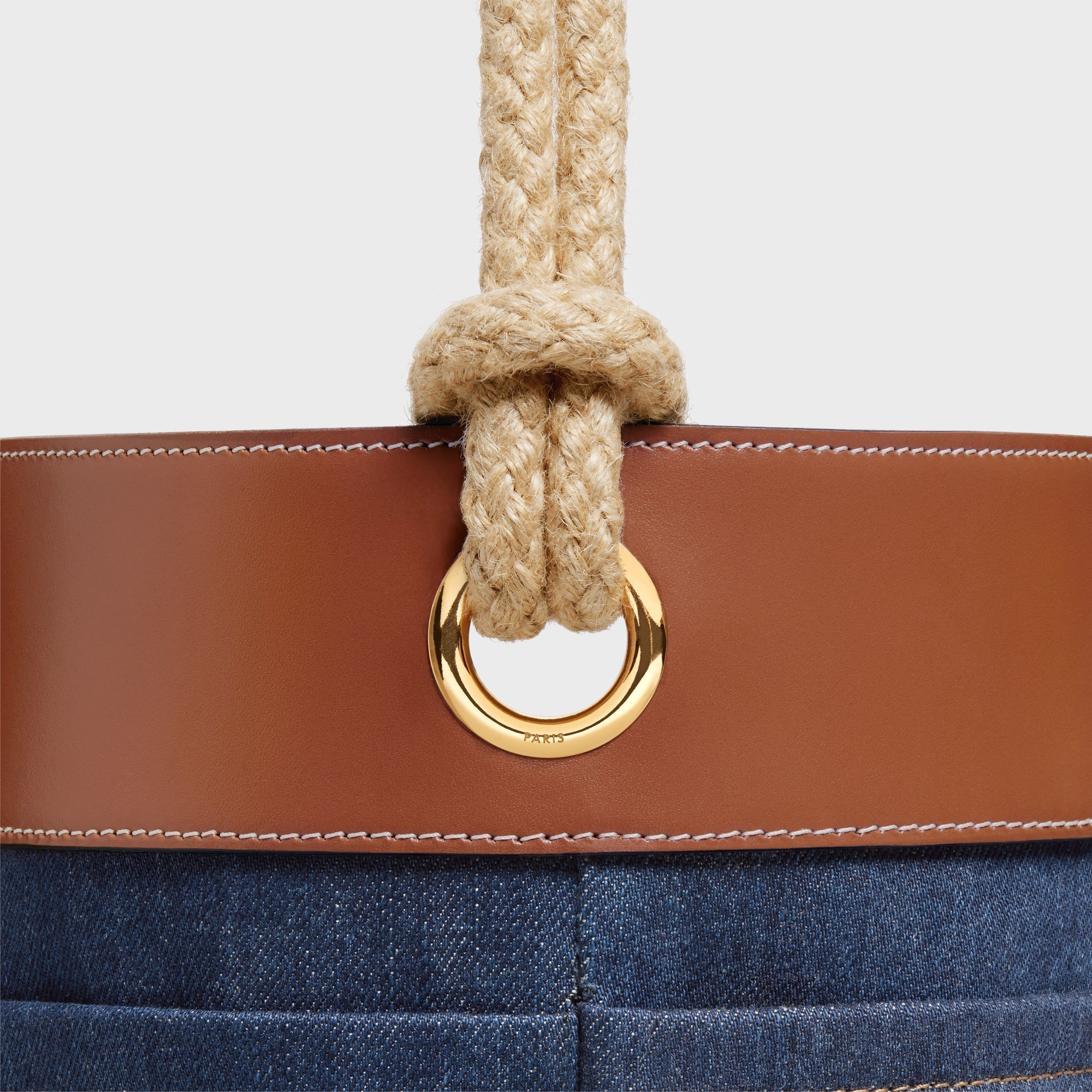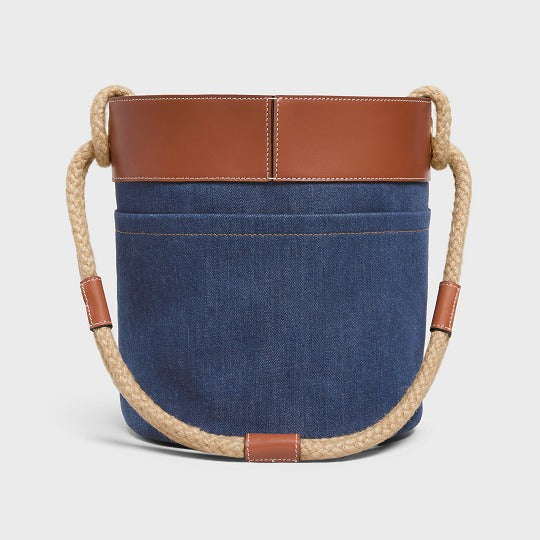 ◇仕様(素材)・デニム、カーフスキンのトリミング・テキスタイル(裏地)・ショルダーキャリー・外側にフラットポケット X 2・ペアロープストラップ (ドロップ 29 CM)・参考: 196272DJD.07AT◇サイズ 19×23×19cm