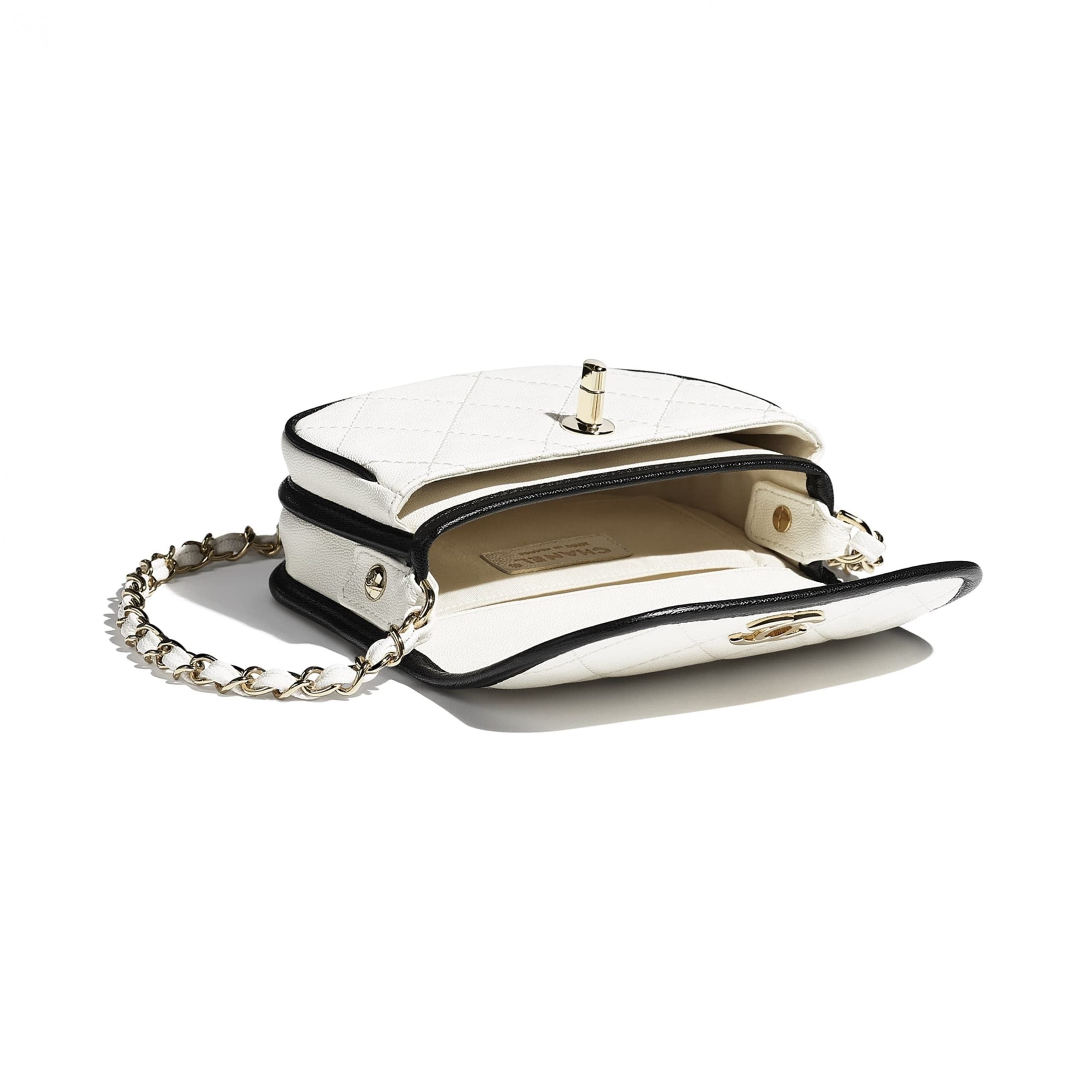 大人気【CHANEL】グレインカーフスキンミニメッセンジャーバッグ大人気!シャネルのミニメッセンジャーバッグのご紹介です。こちらの商品は、グレインカーフスキンを使用しており、上品な光沢のあるボディは美しく、洗練されたデザインはどの世代にも愛されることでしょう。ホワイトとブラックの組み合わせは様々なシーンで重宝されます。普段使いにはもちろんのこと、フォーマルなファッションにも合いますね。