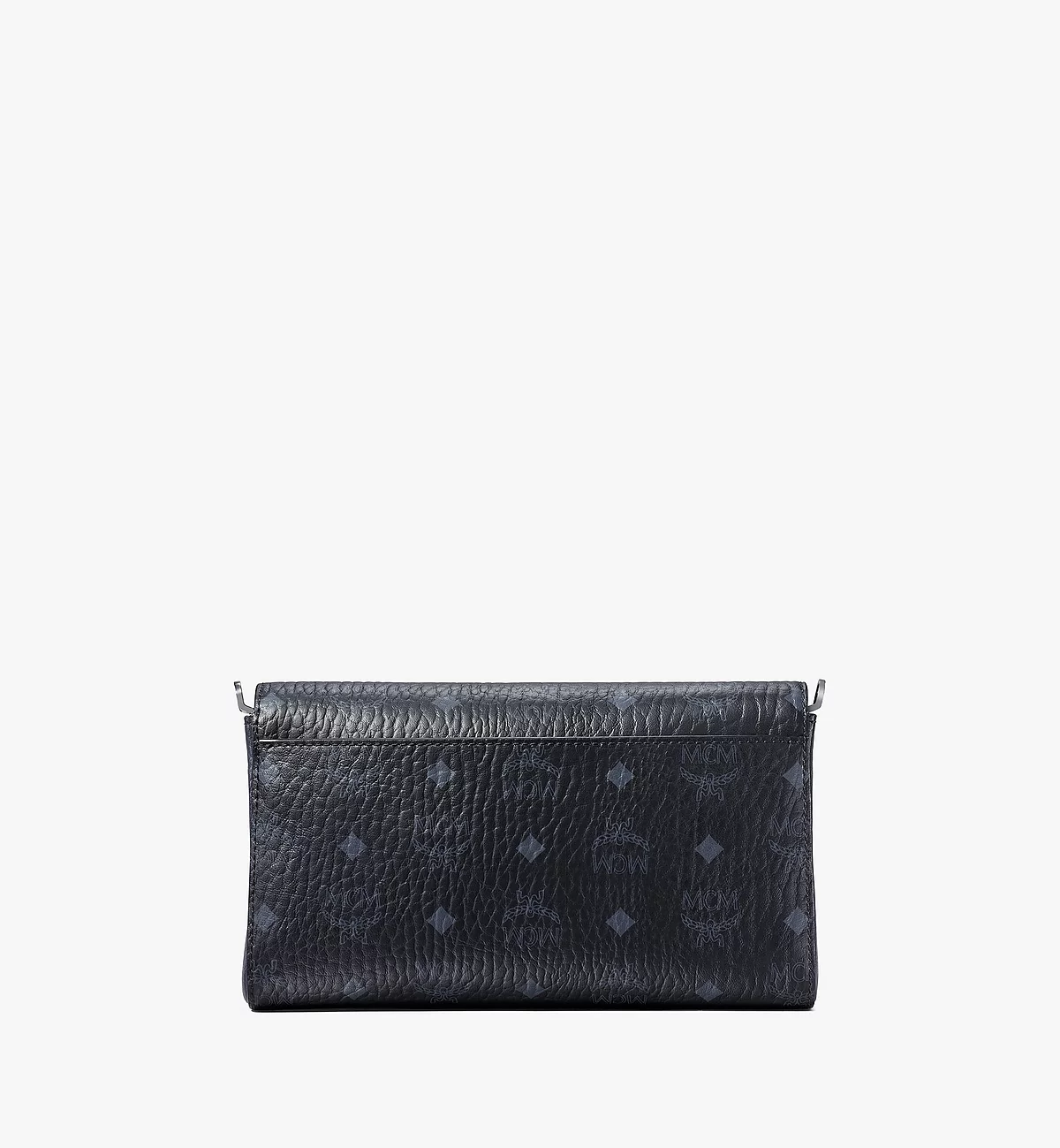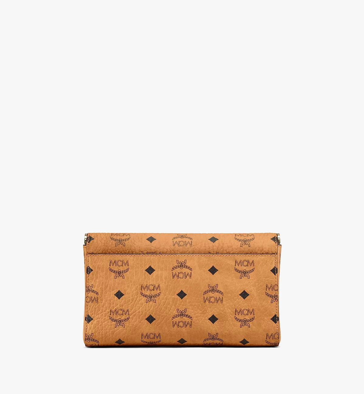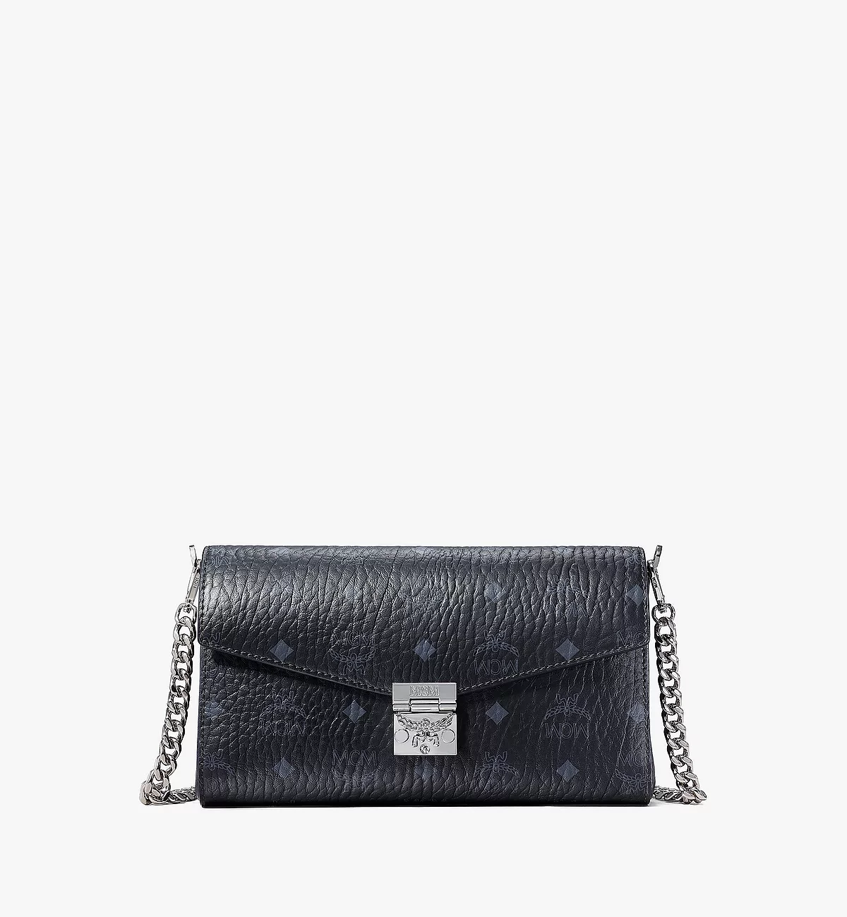 MCMのシグネチャー素材である、軽量なヴィセトス柄コーテッドキャンバスを用いた〈ミリー〉コレクションのフラップ付きクロスボディバッグ。取り外し可能なチェーンストラップ付きで、仕上げにあしらったローレルロックの留め具が、伝説的アイテムならではの自信を醸し出しています。